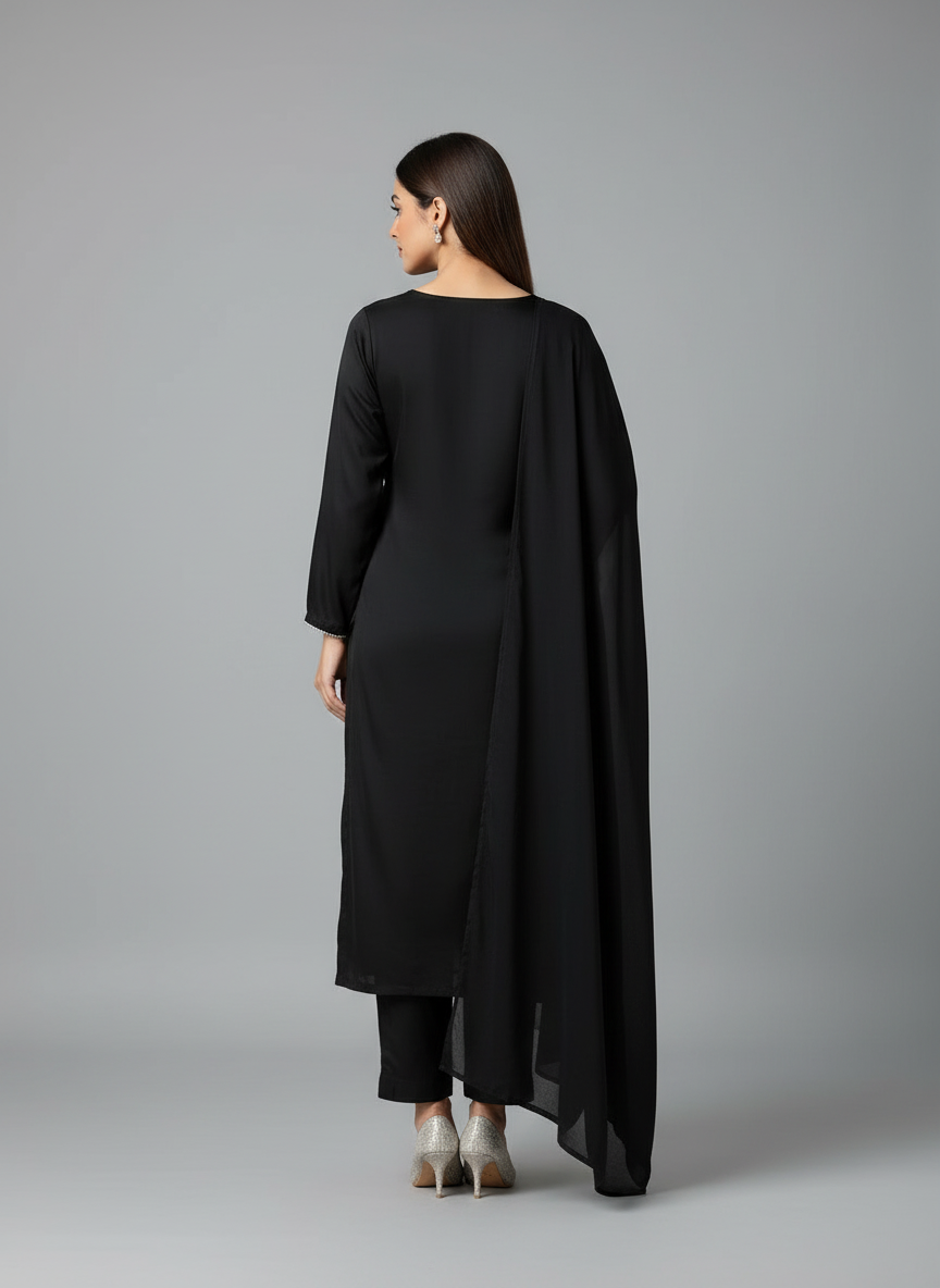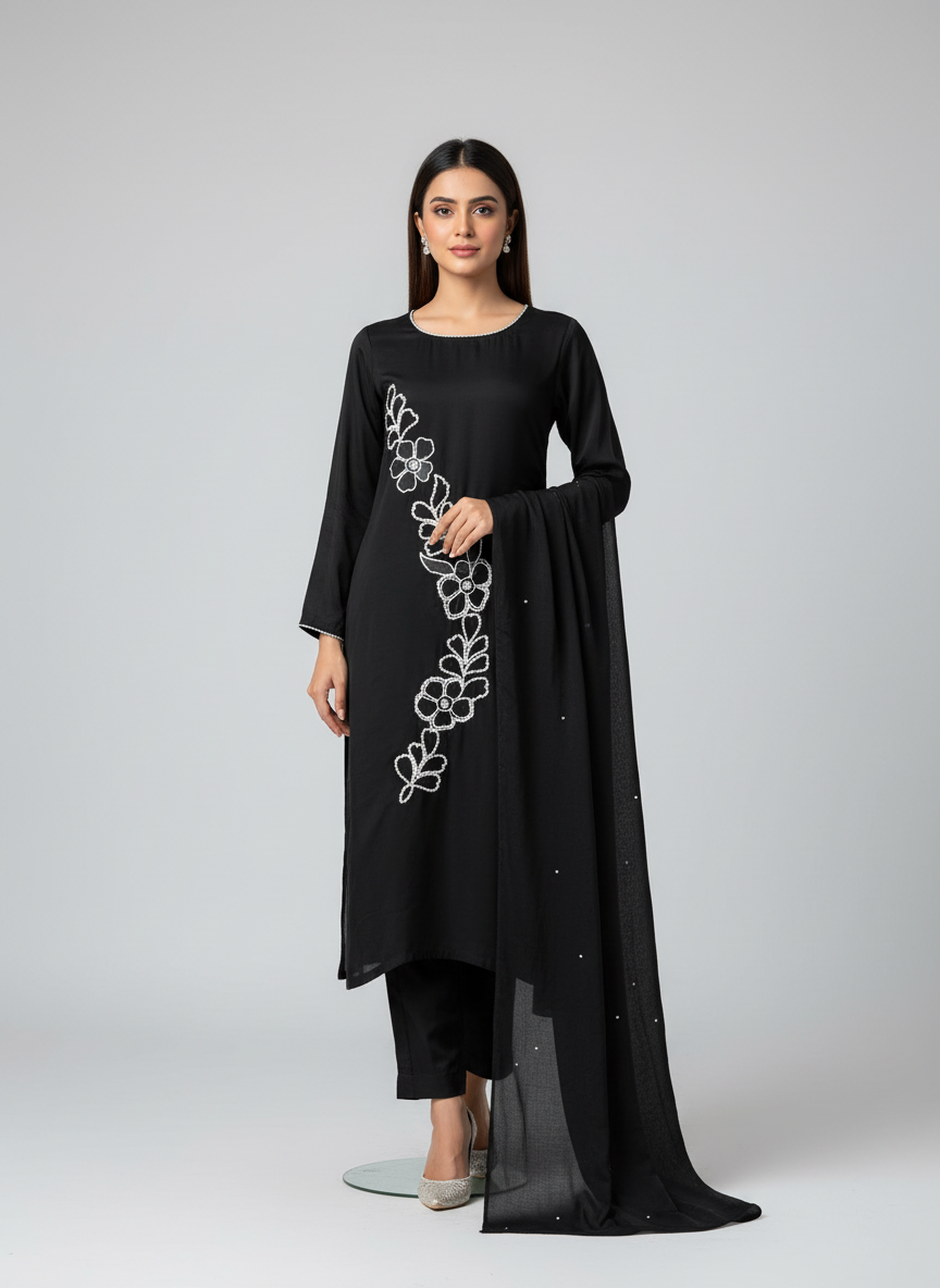 Step into timeless elegance with this sophisticated black kurta set designed for modern grace. The straight-cut kurta features delicate white floral embroidery flowing diagonally across the front, creating a striking contrast against the deep black fabric. Paired with tailored black trousers and a lightweight sheer dupatta adorned with subtle embellishments, this ensemble offers a refined and effortlessly chic look. Perfect for evening gatherings, festive occasions, or formal events.